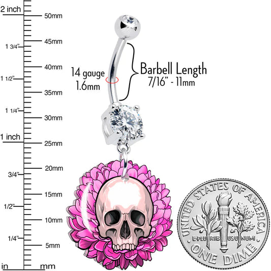 30% OFF class="card__heading" > Clear Gem Blooming Pink Flower Skull Dangle Belly Ring by Onyx O