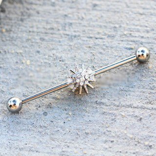 Add elegant celestial beauty to your industrial piercing with this 316L stainless steel jeweled sparkling star industrial barbell featuring stunning design! Perfect for those who love stars, celestial themes, and sparkling accents.