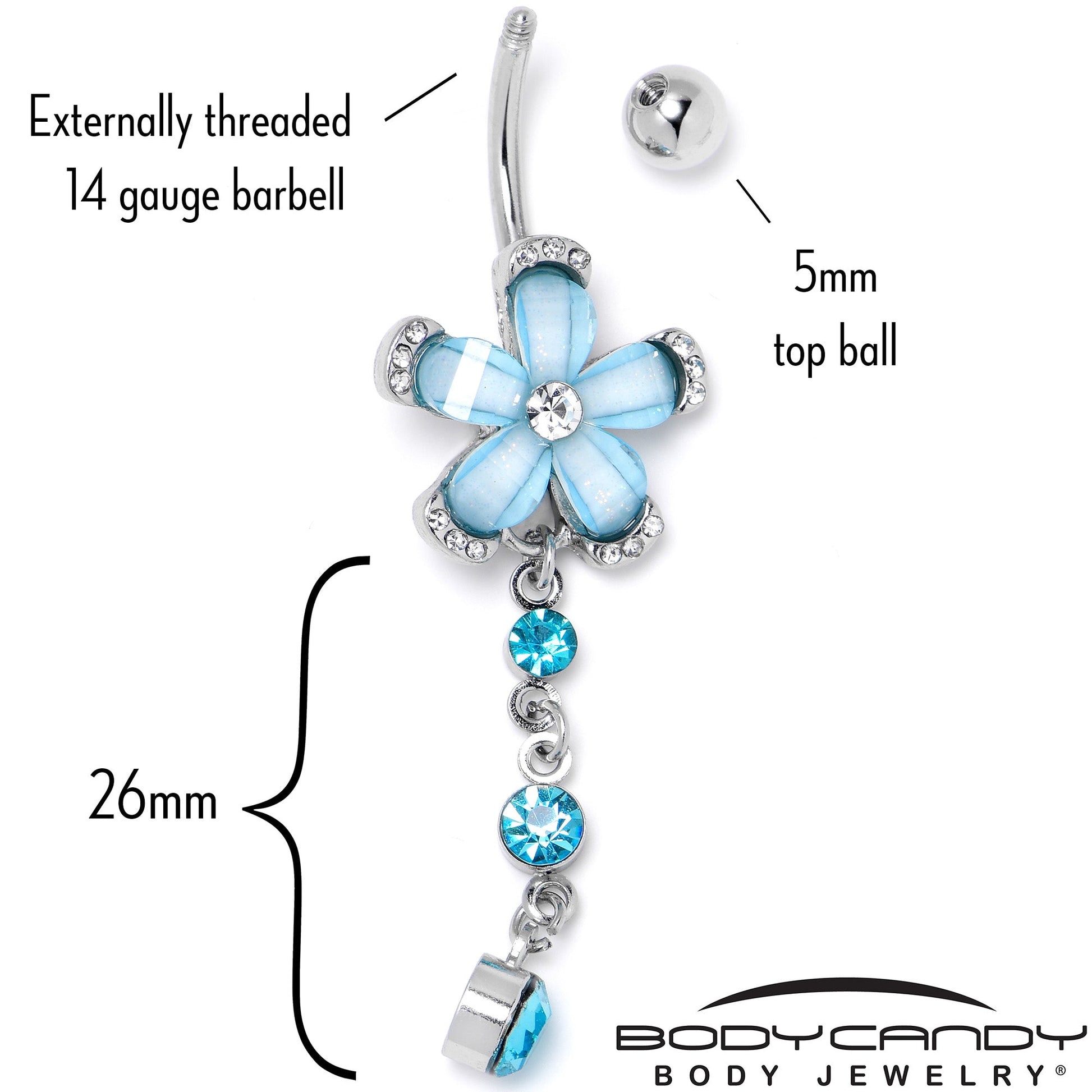 Up the glam in your look with this 14 gauge floral navel ring. It is made with a 3/8 inch durable 316L surgical grade stainless steel curved barbell with a 5mm top ball end. The bottom ball end features a flower charm, composed of alternating blue petals, tipped with clear gems and a clear gem center. Dangling beneath are two more round, blue gems for a cohesive appearance. You will style to spare with this fabulous floral belly piercing jewelry.Specifications