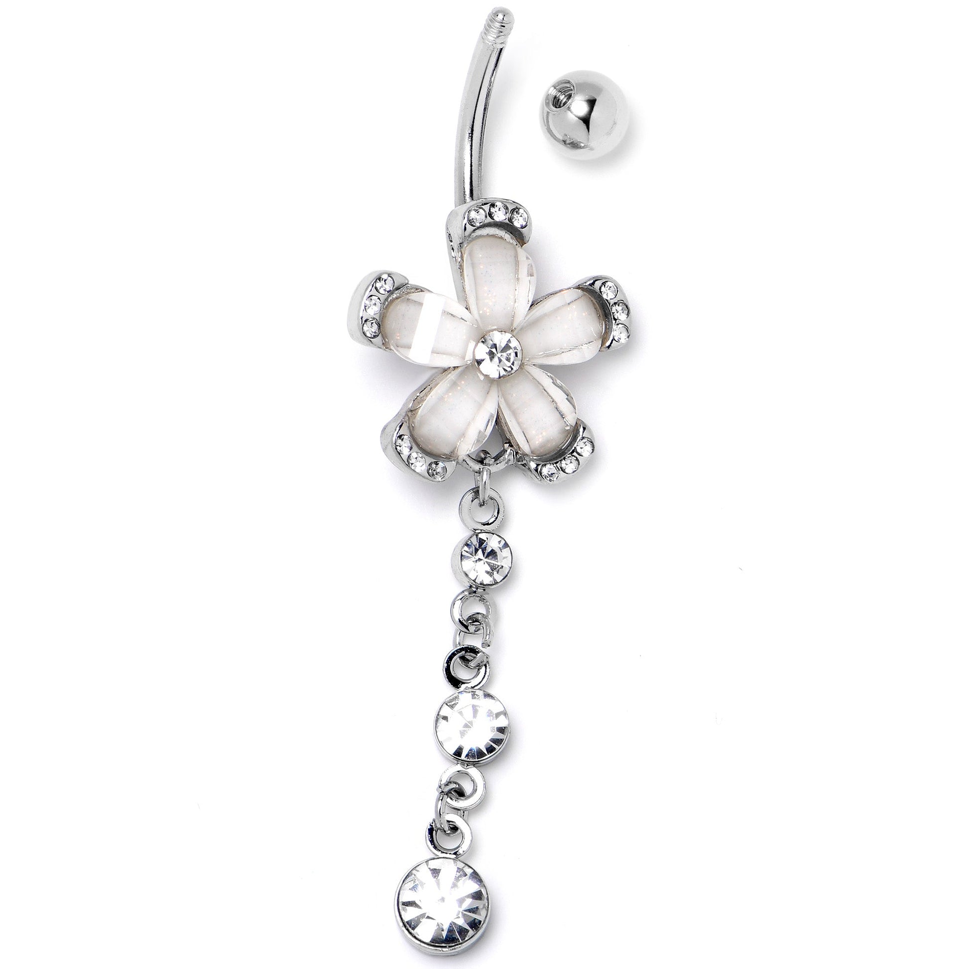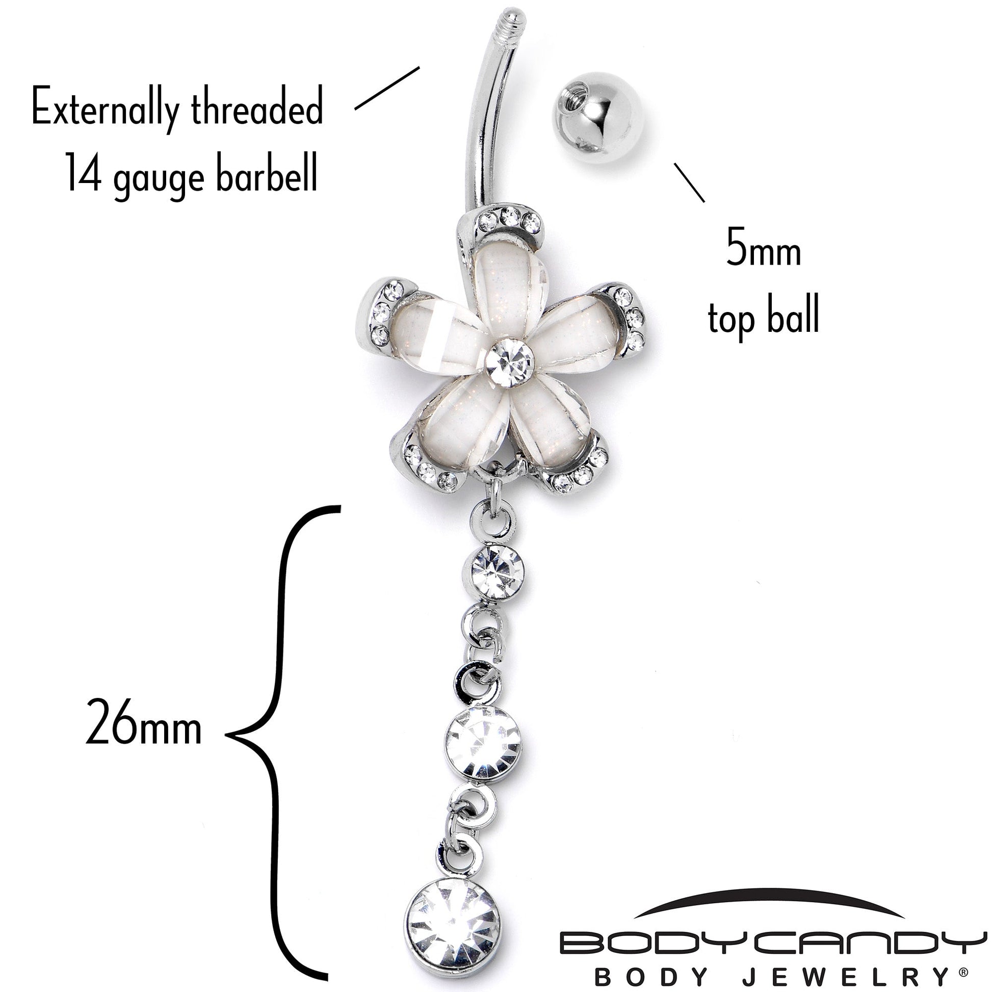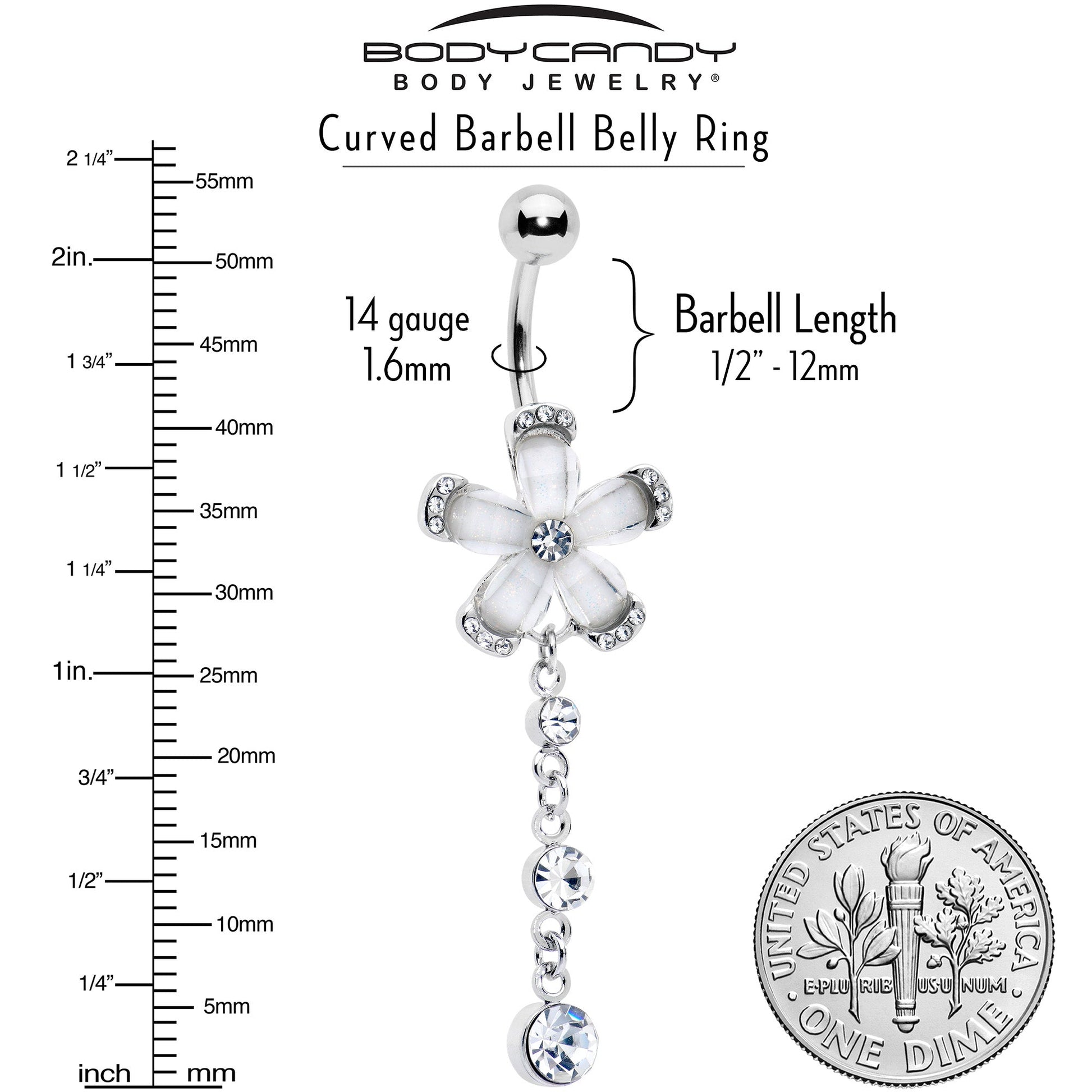 Up the glam in your look with this 14 gauge floral navel ring. It is made with a 3/8 inch durable 316L surgical grade stainless steel curved barbell with a 5mm top ball end. The bottom ball end features a flower charm, composed of alternating white petals, tipped with clear gems and a clear gem center. Dangling beneath are two more round, clear gems for a cohesive appearance. You will style to spare with this fabulous floral belly piercing jewelry.Specifications