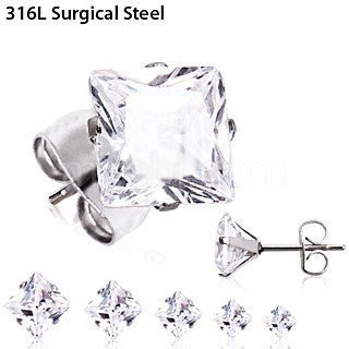 316L surgical steel princess cut CZ stud earrings - Elegant square sparkle for everyday wear