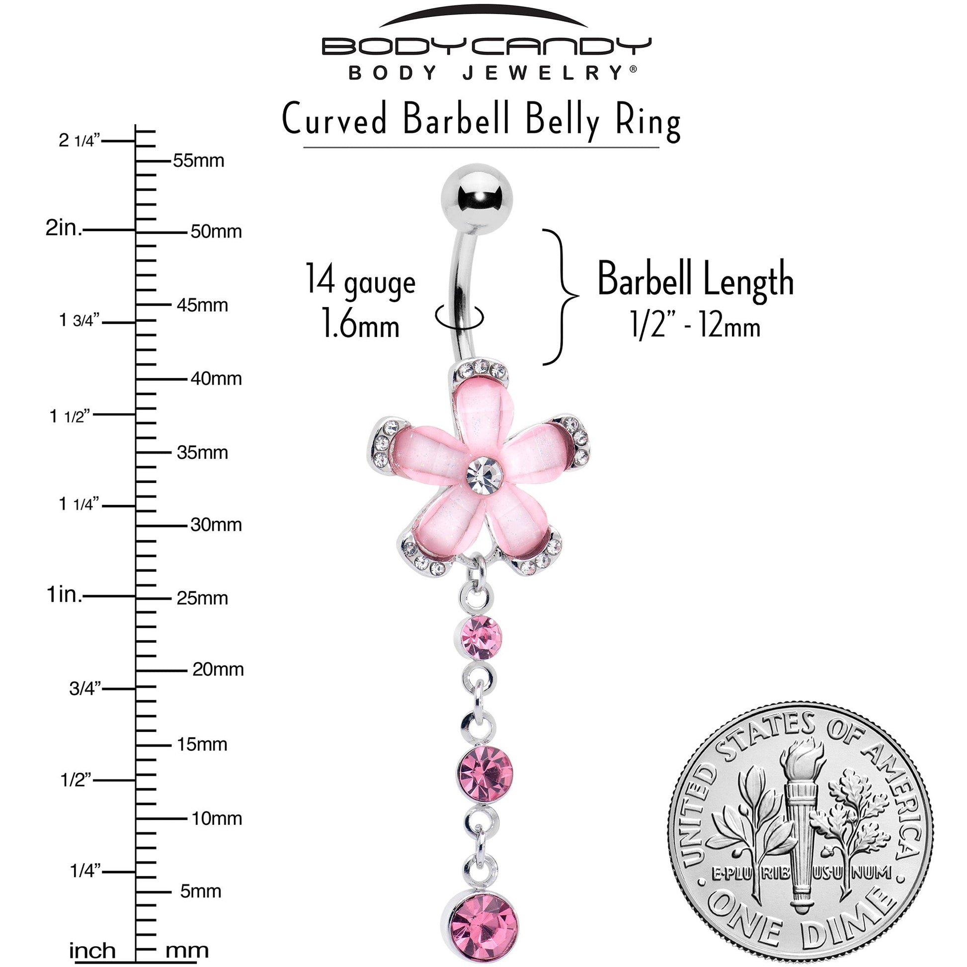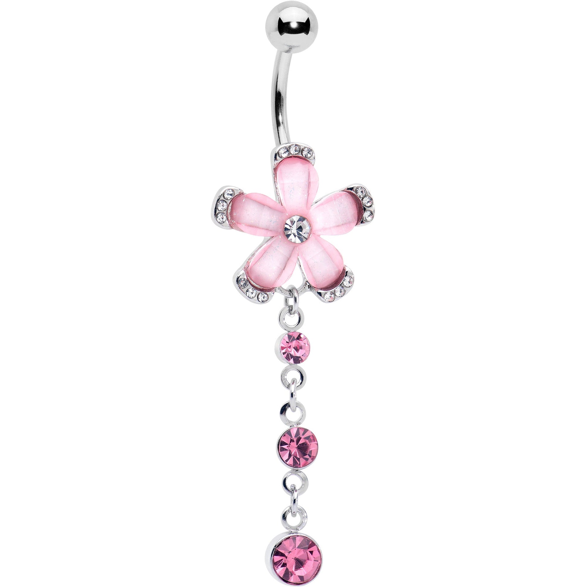 Up the glam in your look with this 14 gauge floral navel ring. It is made with a 3/8 inch durable 316L surgical grade stainless steel curved barbell with a 5mm top ball end. The bottom ball end features a flower charm, composed of alternating pink petals, tipped with clear gems and a clear gem center. Dangling beneath are two more round, pink gems for a cohesive appearance. You will style to spare with this fabulous floral belly piercing jewelry.Specifications