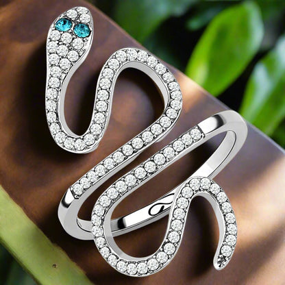 Indulge in the exquisite charm of this Women's Stainless Steel Crystal Snake Ring. Its high polished finish (no plating) and sparkling crystals with blue zircon eyes make for a captivating and alluring sight.
