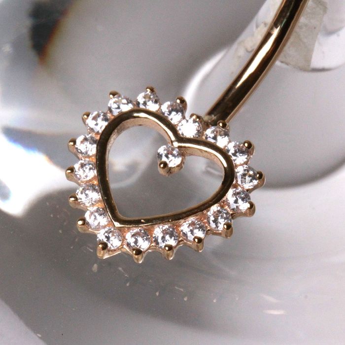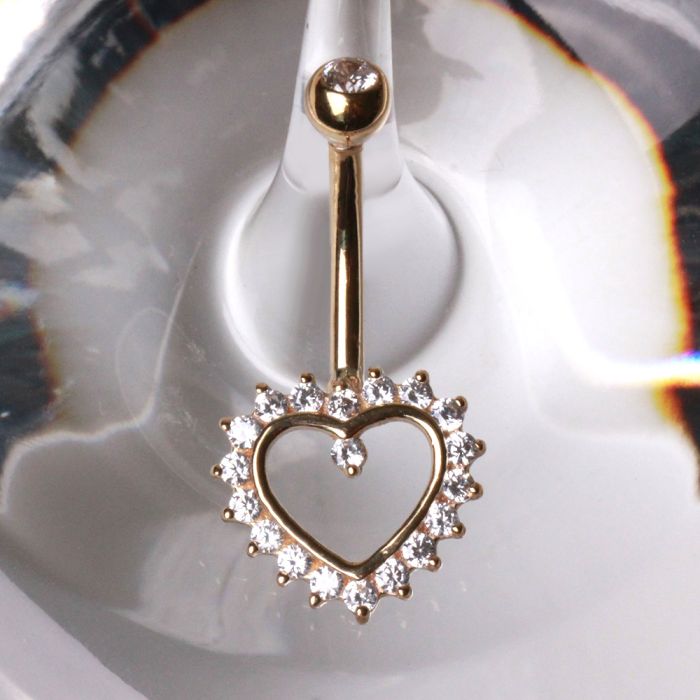 Fall in love with this stunning 14kt solid yellow gold heart belly ring featuring a beautiful heart design completely surrounded by sparkling cubic zirconia! This is genuine, certified 14kt gold - not plated - making it a true luxury investment piece for your body jewelry collection.