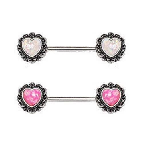 316L stainless steel filigree synthetic opal heart nipple bars - Antique romantic elegance