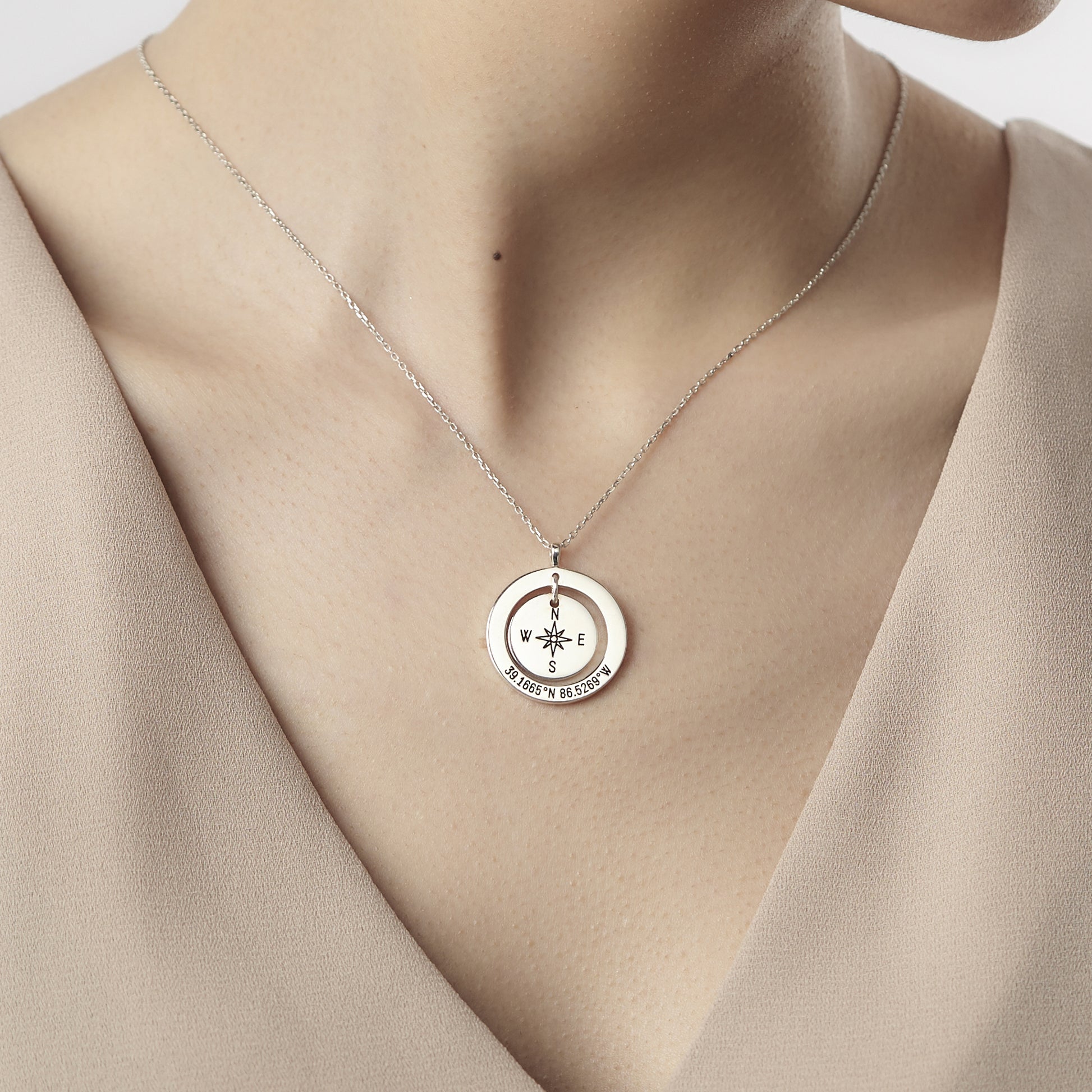 ABOUT THIS ITEM This compass necklace can be personalized with coordinates of your favorite location on one side and a message (up to 4-5 words) on the other side of the outer circle.