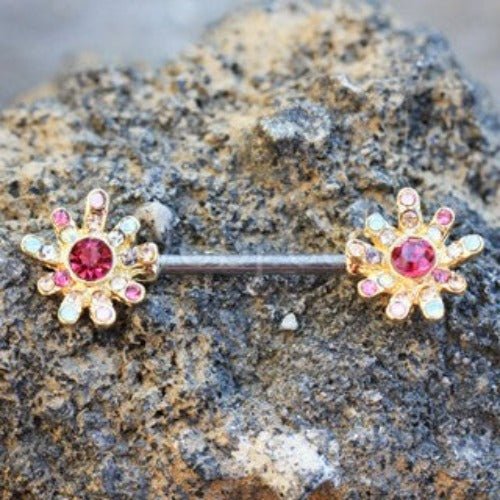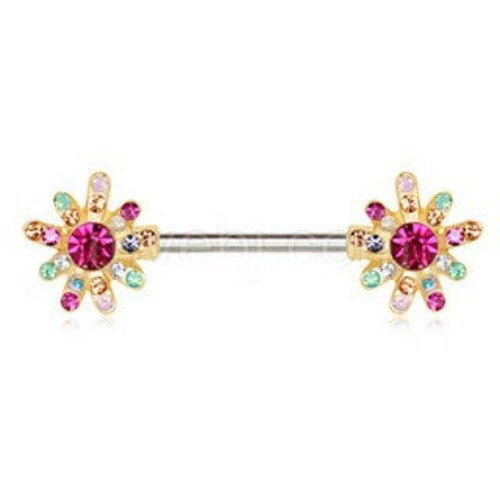 Gold plated rainbow CZ flower nipple bar - Colorful elegant body jewelry