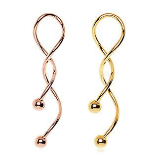 Make a stunning statement with this popular spiral navel ring that features rich gold plating and an elegant elongated design! This eye-catching piece showcases a beautiful spiral shape that creates graceful curves and movement, making it perfect for those who want to stand out with unique, sophisticated body jewelry. Available in both luxurious yellow gold and romantic rose gold plating, you can choose the perfect tone to complement your skin and style. The spiral design features uneven ends that measure 36mm and 45mm from the top, creating an asymmetrical, artistic look that's both modern and timeless. Crafted from premium 316L stainless steel and polished to an exquisite finish, this spiral navel ring combines the warm glow of gold plating with the durability and hypoallergenic properties of surgical steel. The mirror-polished surface creates a brilliant shine that catches the light beautifully. Each end features a 5mm ball that provides secure, comfortable wear while adding to the elegant design. Measuring 14 gauge (1.6mm) thickness with an impressive 2 inch (50mm) length, this long spiral belly ring creates a dramatic, elongated look that's perfect for beach days, summer style, or making a bold fashion statement. Perfect for those who love unique designs, elegant gold jewelry, spiral aesthetics, or anyone seeking sophisticated body jewelry that combines artistry with quality craftsmanship!
