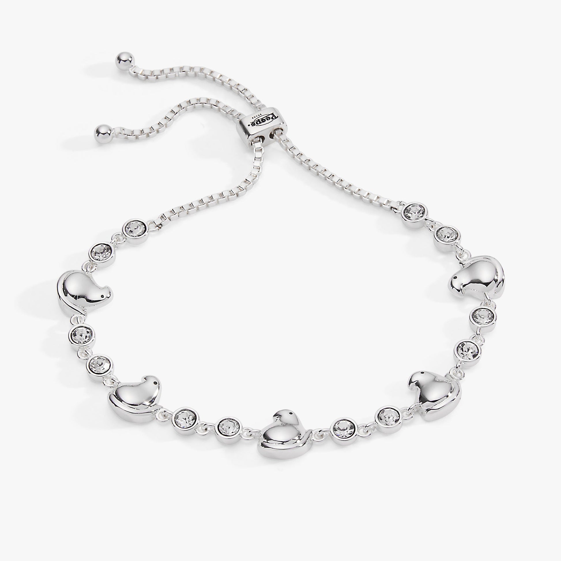 Hop into spring with our adorable PEEPS® Chick Bolo Bracelet! This charming design features silver or gold-plated metal chicks adorned with sparkling clear crystal stones, bringing a whimsical touch to your wrist. Perfect for PEEPS® fans and those who love a little seasonal fun, this bolo-style bracelet combines collectible appeal with wearable style. A delightful way to celebrate the season's sweetest icon.
