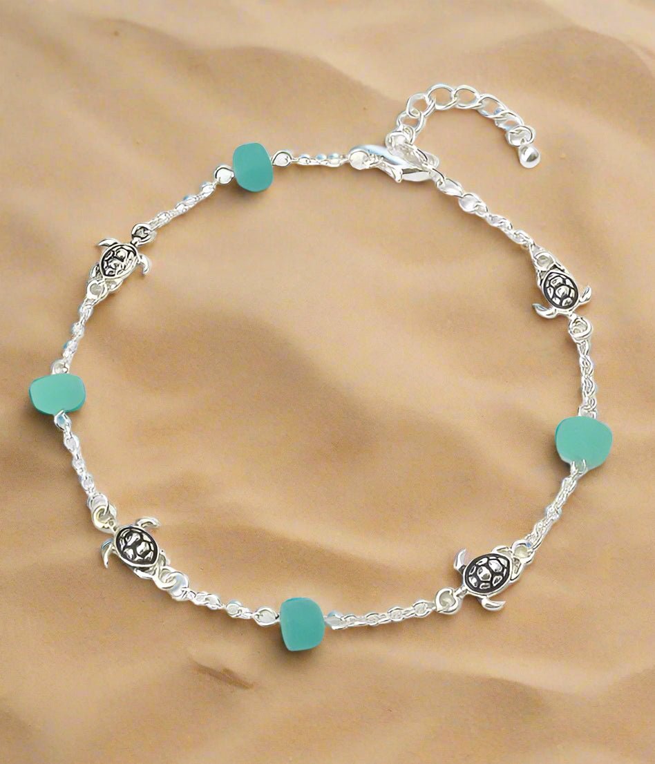 With its summer beachy feel, this Turtle Seaglass Beach Anklet is the perfect accessory for warm weather. Featuring shades of blue and turquoise seaglass accents and a lobster claw clasp, this piece is adjustable from 8 to 11 inches in length. Embrace the beauty of the ocean and add a touch of whimsy to your summer style.